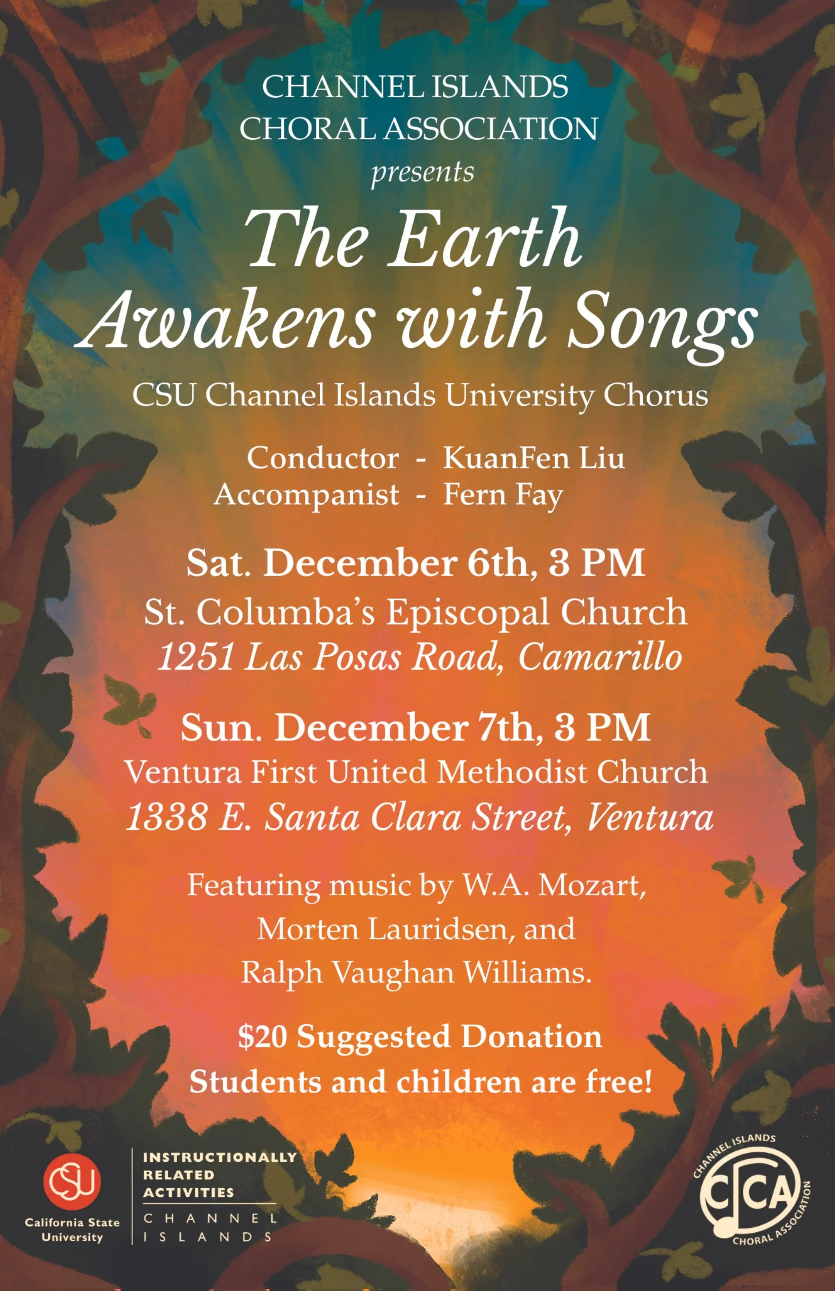 The CSUCI University Chorus will perform selections from Morten Lauridsen’s Mid-Winter Songs, Ralph Vaughan Williams’ Five Mystical Songs, Mozart’s Coronation Mass, and other pieces for the holiday season, conducted by Dr. KuanFen Liu.