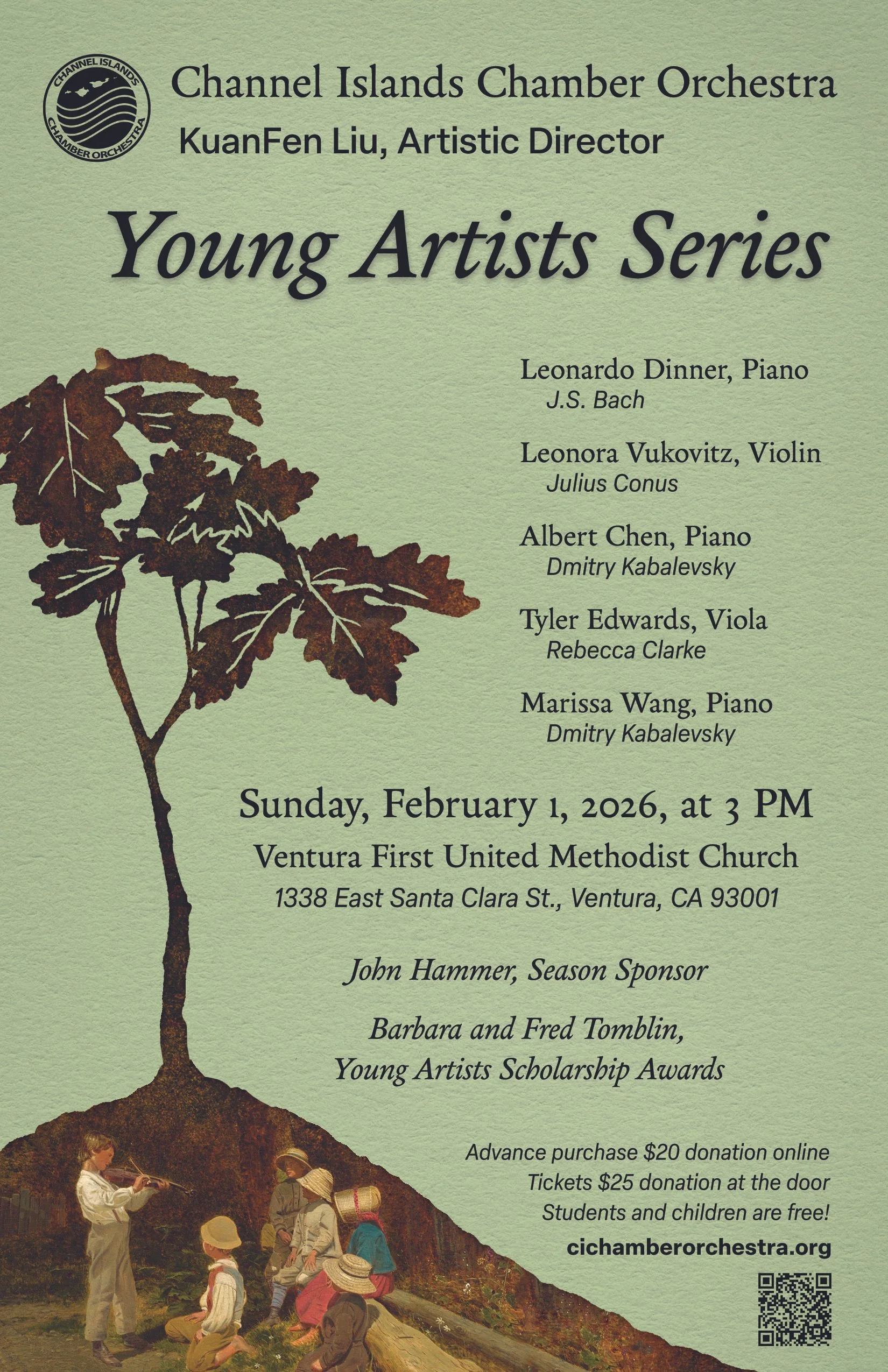 Soloists Kaleb Chavez, Eileen Zhang, Lori Qian, Mia Eddy and Benjamin Chung performed with the Channel Islands Chamber Orchestra in works by Saint-Saëns, Doppler, Beethoven and Ravel. In addition, the orchestra performed The Moldau by Bedrich Smetana.