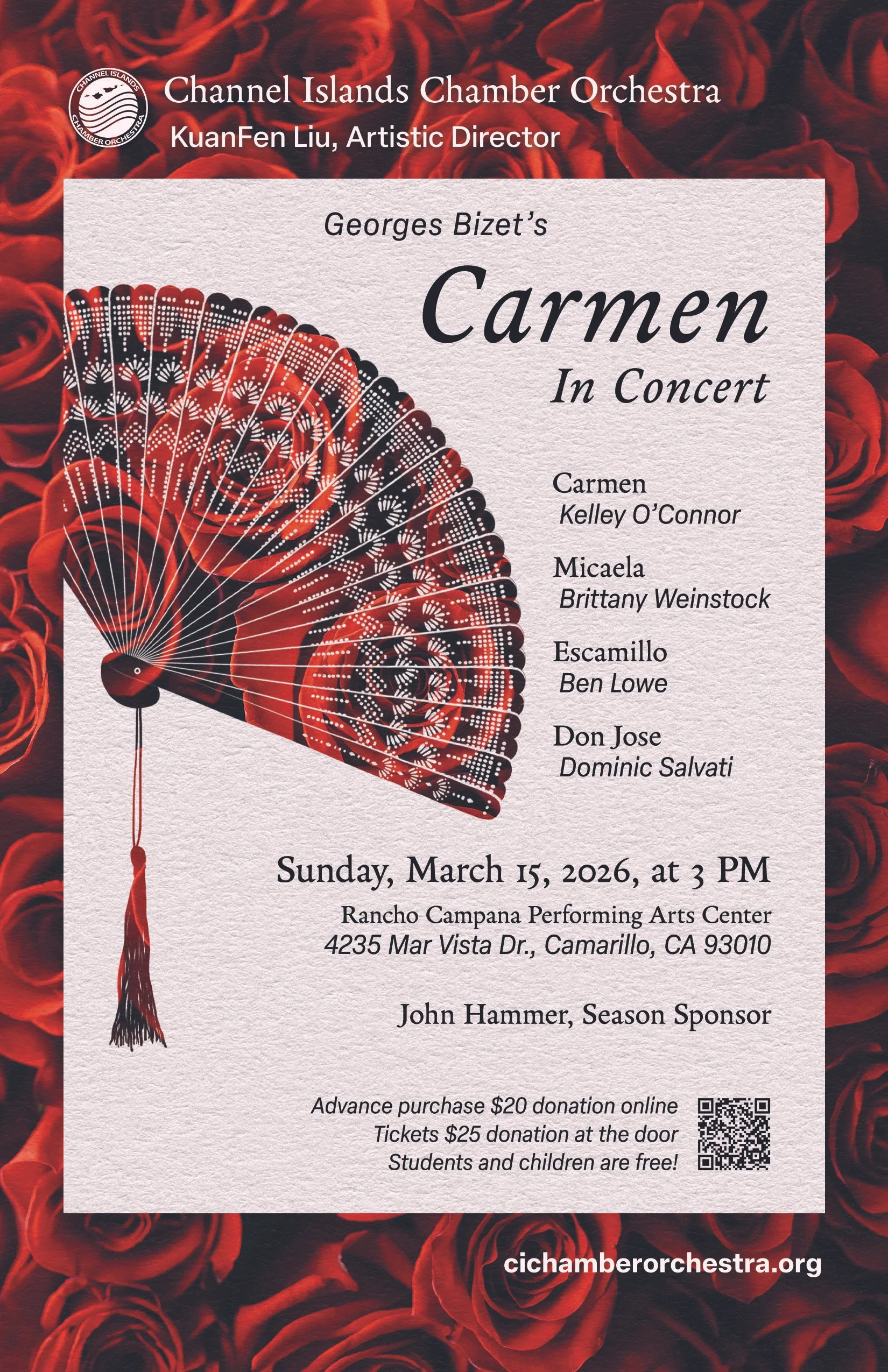 Passion, jealousy, and fate ignite in Georges Bizet’s Carmen—one of the most beloved and electrifying works in the operatic repertoire. In this thrilling semi-staged concert presentation, the Channel Islands Chamber Orchestra brings Bizet’s masterpiece to life with vivid orchestral color, powerful choral moments, and unforgettable melodies that have captivated audiences for generations.